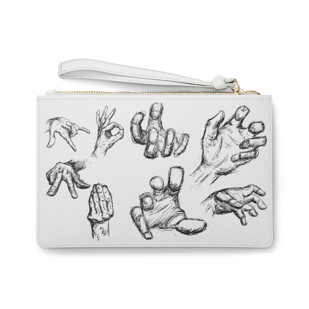 Hands can express a lot of feelings, thoughts and more. Take your hands (other then your own) with you with these (hand drawn) hands! Designed with a loop handle to quickly free your hands, this custom clutch bag is made for the fashionista on the go. It can hold everyday essentials such as a phone, wallet, and keys. It features a zip fastening and a fully lined internal pocket. It is made of vegan leather in the Saffiano pattern finish that was invented by Prada.