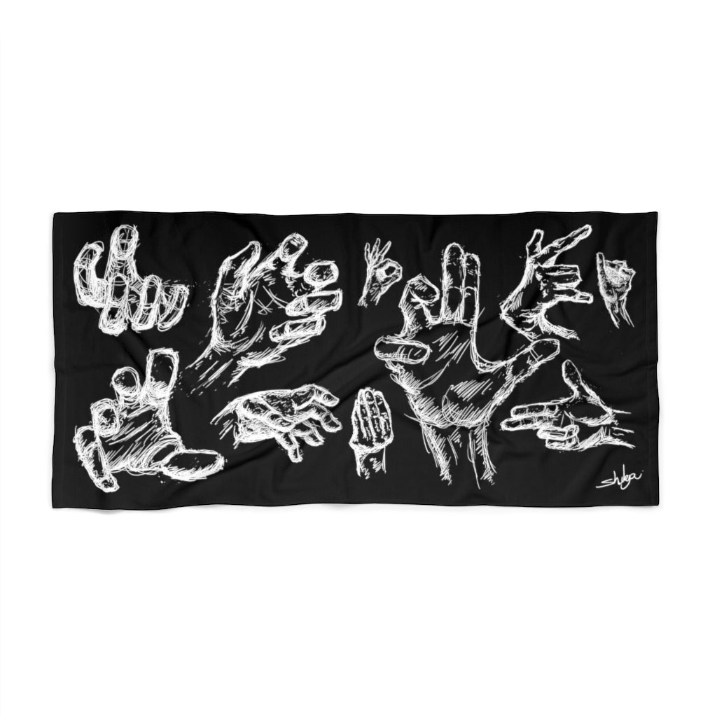Hands can express a lot of feelings, thoughts and more. Take your hands (other then your own) with you with these (hand drawn) hands! Show up on the beach with a vibrant and super soft beach towel. One-sided print, polyester facing with cotton loop backing for extra lush absorbency.