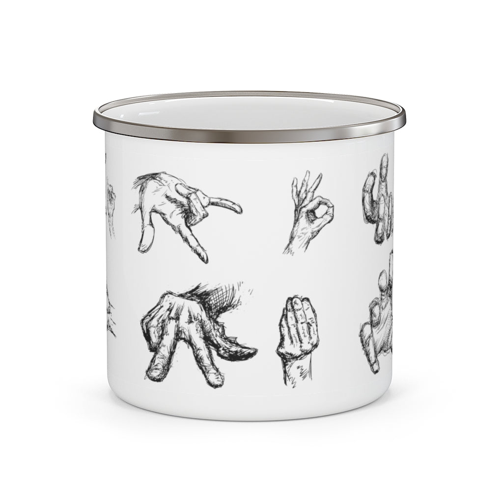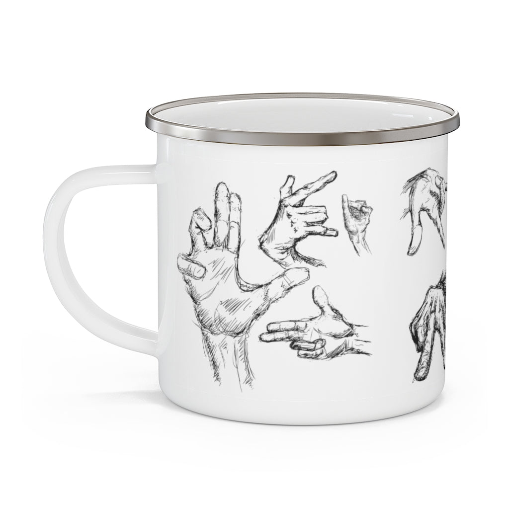 Hands can express a lot of feelings, thoughts and more. Take your hands (other then your own) with you with these (hand drawn) hands! Great for indoors and outdoors activities as it can keep up with the dirt and grunge of campsites. This sturdy and stylish cup is perfect for coffee, tea or even your morning cereal in the wild.