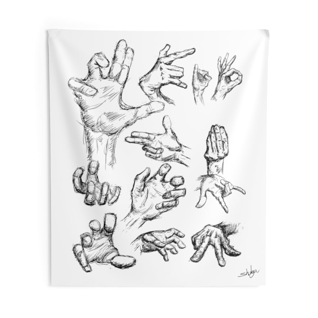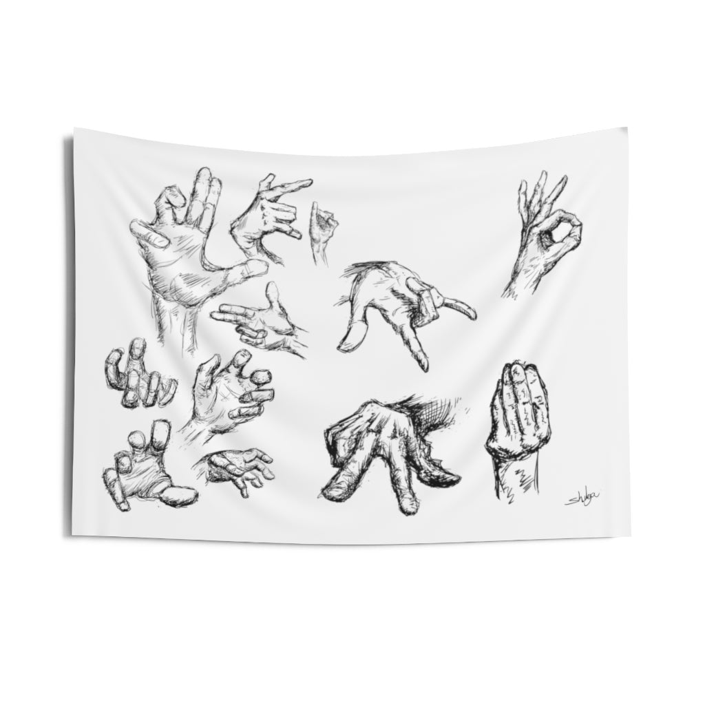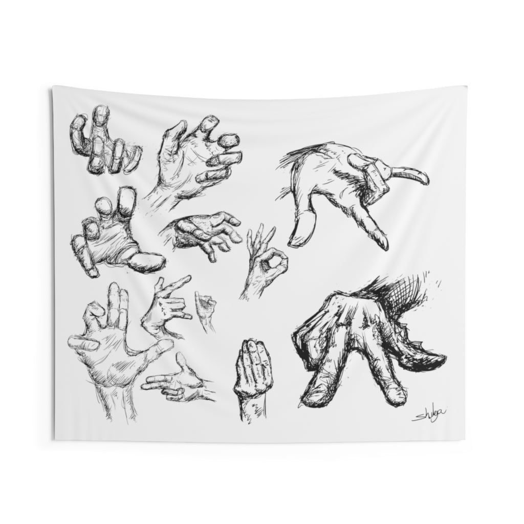 Hands can express a lot of feelings, thoughts and more. Take your hands (other then your own) with you with these (hand drawn) hands! A custom wall tapestry is a surefire way to uplift any room’s aesthetics with a personal touch. This 100% Polyester wall tapestry comes with hemmed edges for extra durability while its mildew and water-resistant properties ensure years worth of decorating bliss. The advanced tapestry printing techniques guarantee crisp detail even for the craziest of designs, in any of our multiple size choices.