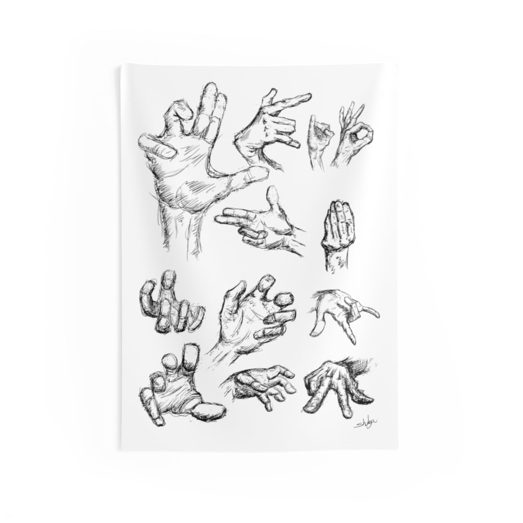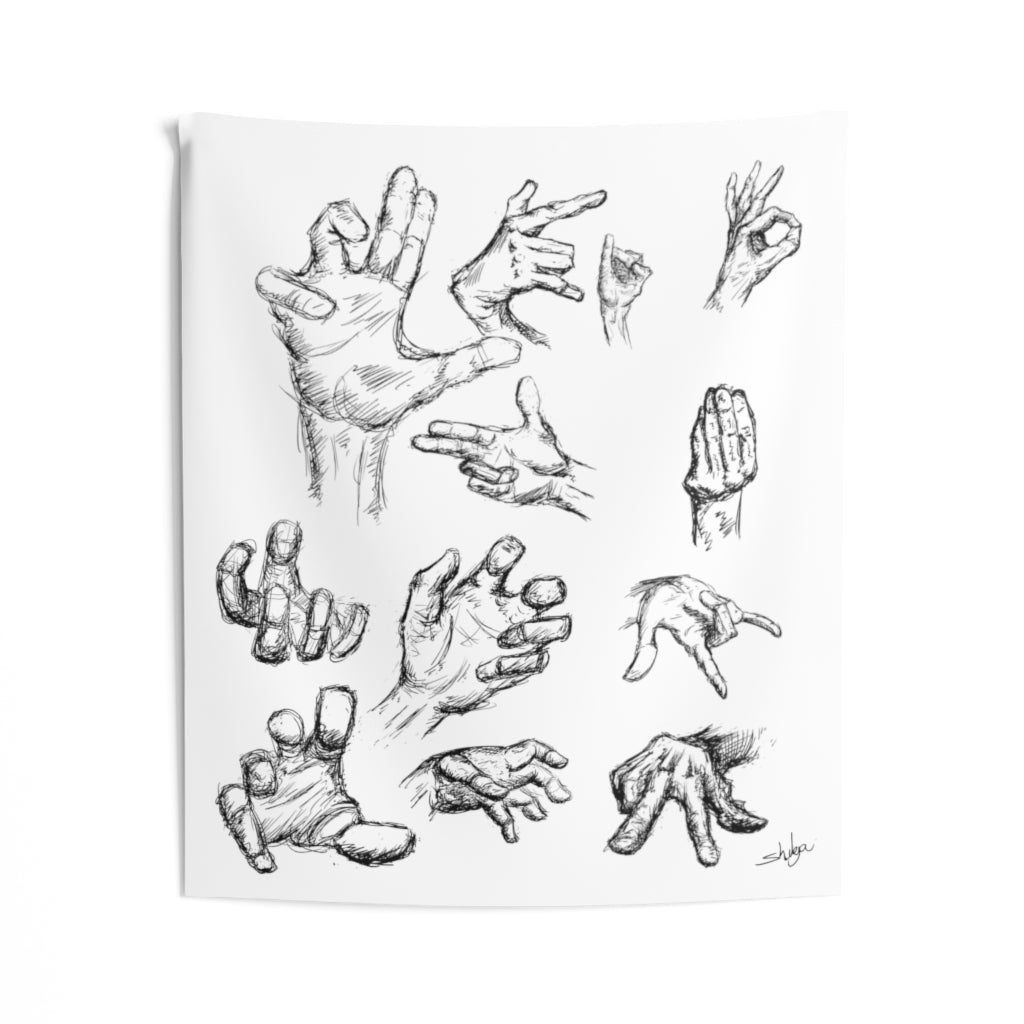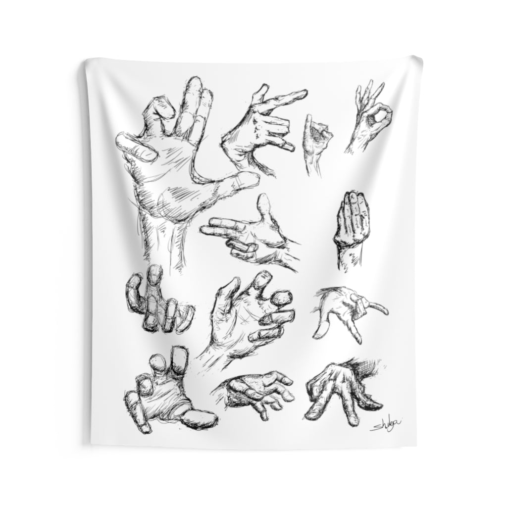 Hands can express a lot of feelings, thoughts and more. Take your hands (other then your own) with you with these (hand drawn) hands! A custom wall tapestry is a surefire way to uplift any room’s aesthetics with a personal touch. This 100% Polyester wall tapestry comes with hemmed edges for extra durability while its mildew and water-resistant properties ensure years worth of decorating bliss. The advanced tapestry printing techniques guarantee crisp detail even for the craziest of designs, in any of our multiple size choices.