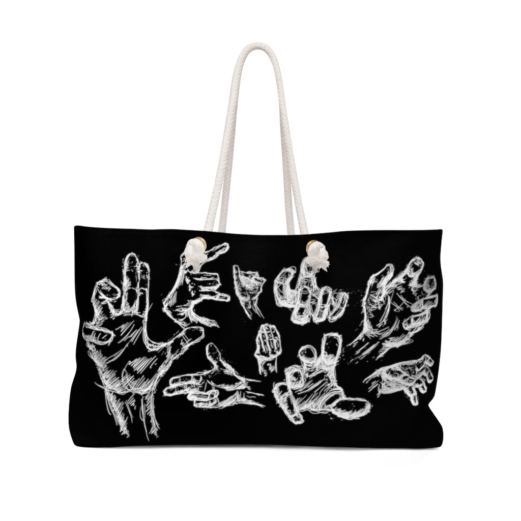 Hands can express a lot of feelings, thoughts and more. Take your hands (other then your own) with you with these (hand drawn) hands! This oversized Weekender Tote is perfect for your weekend at the beach or in town. The wide-mouthed, durable bag holds a generous amount of personal items and is easily held by its thick rope handles.