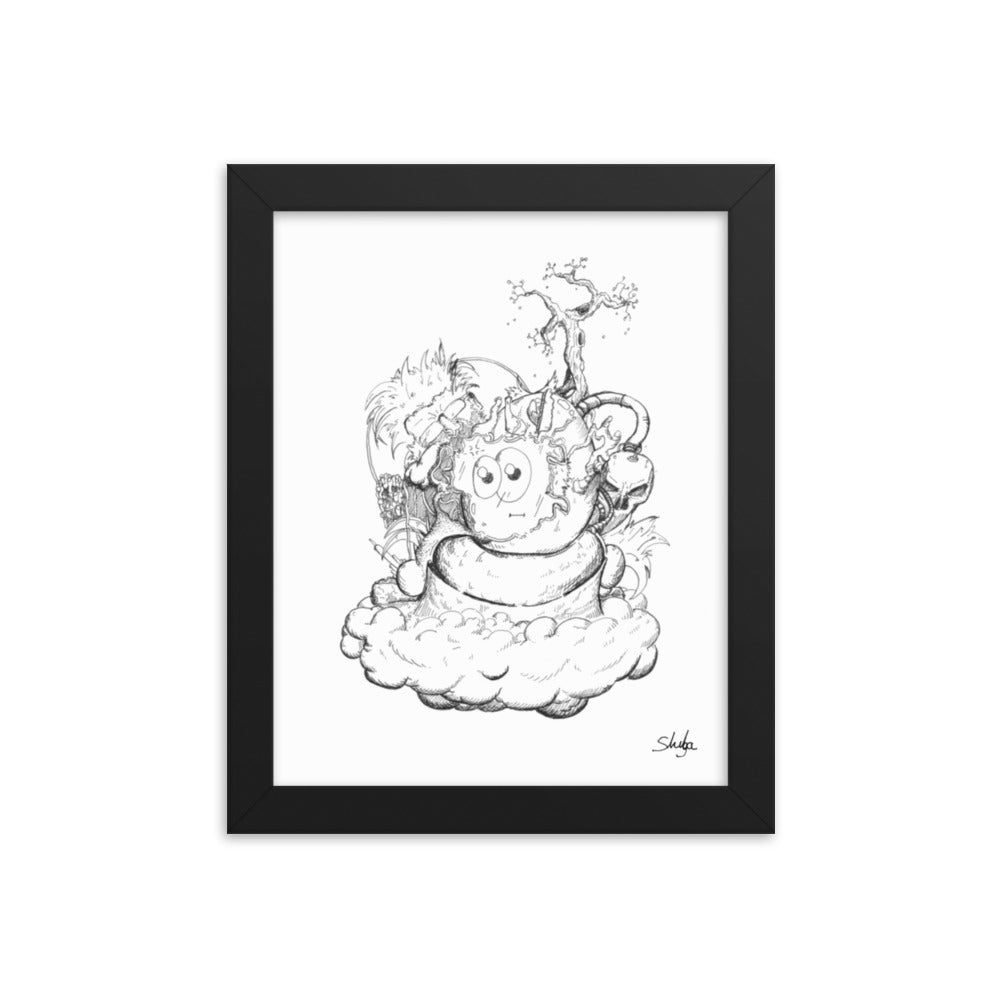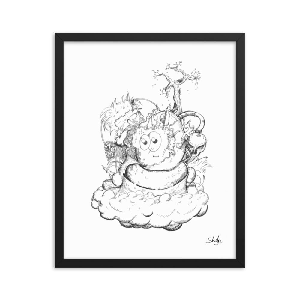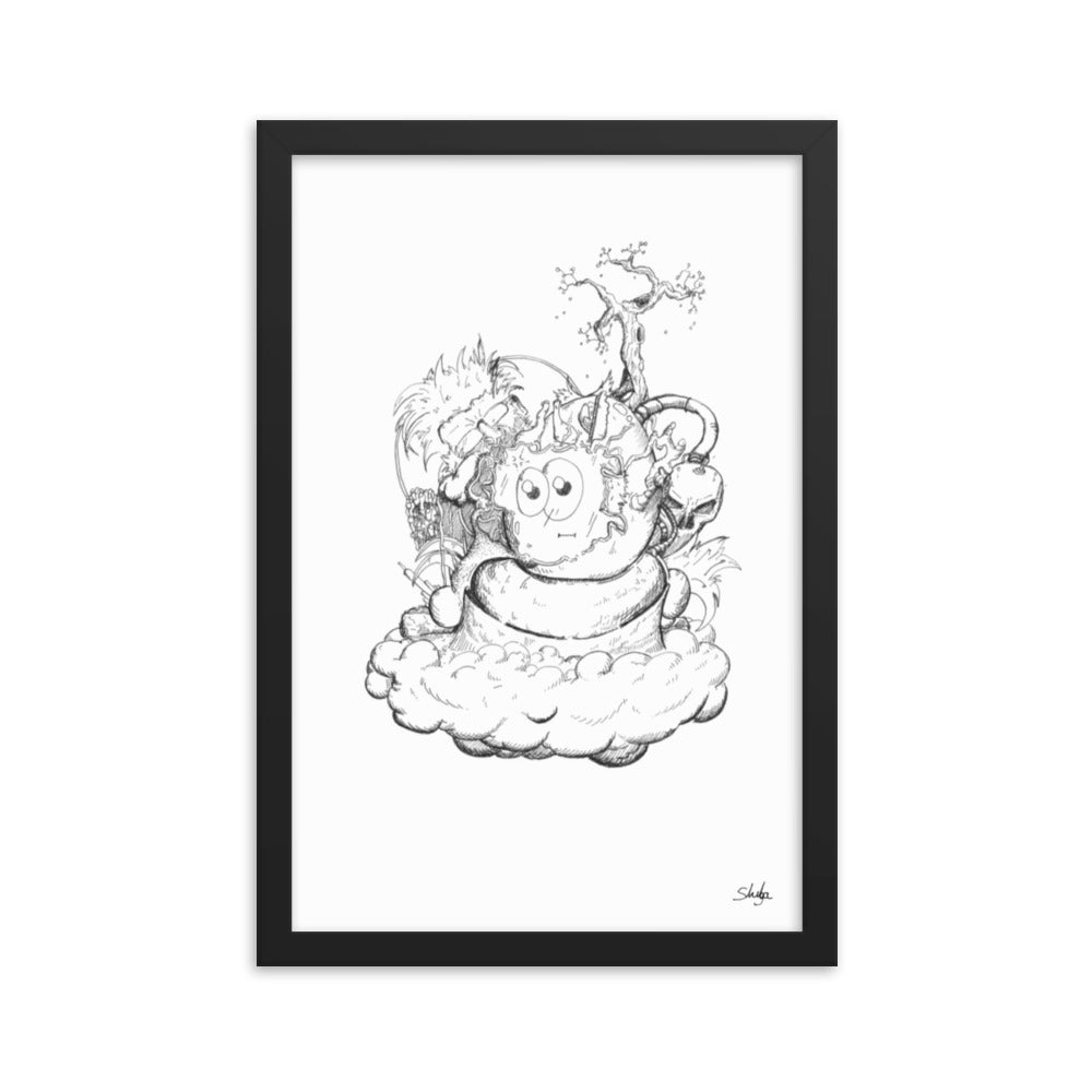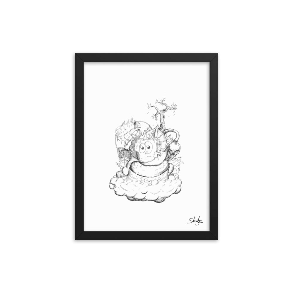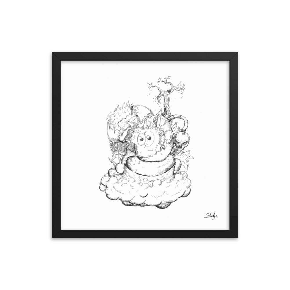 Free hand ink drawing scanned digitally for print on thick, durable, matte paper. The matte black frame that's made from wood from renewable forests adds an extra touch of class.