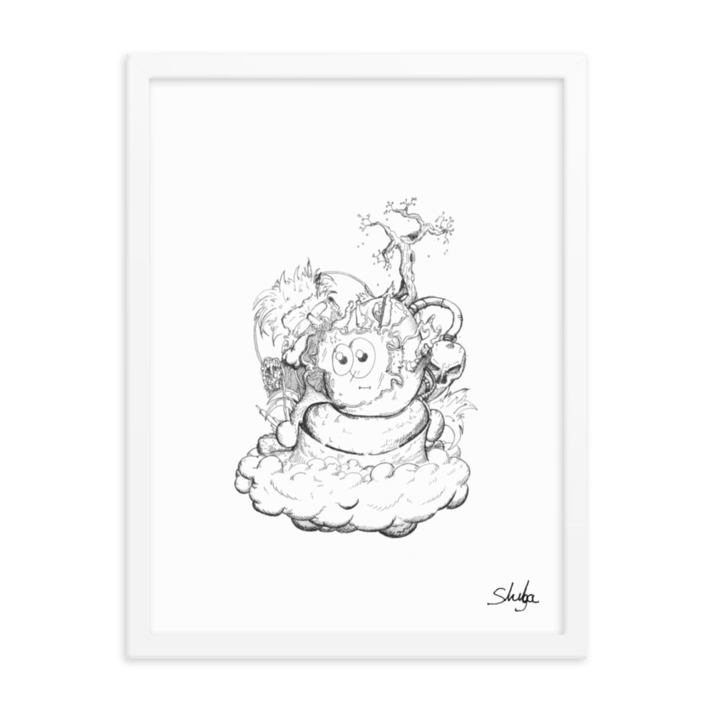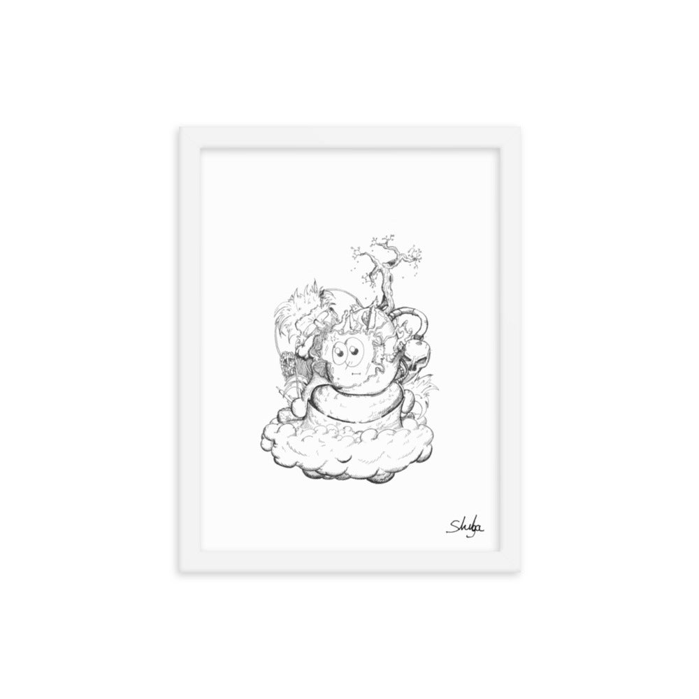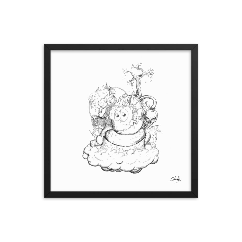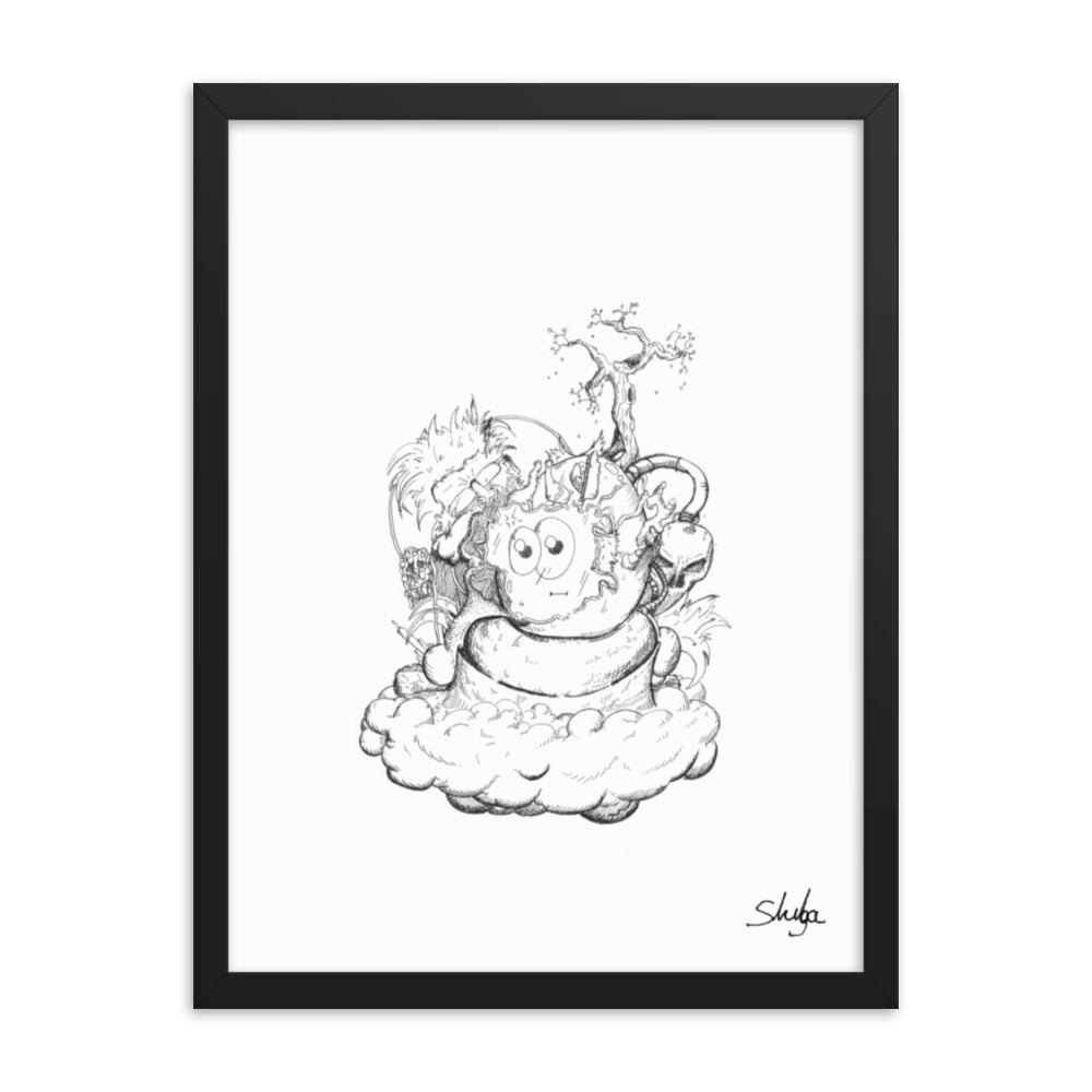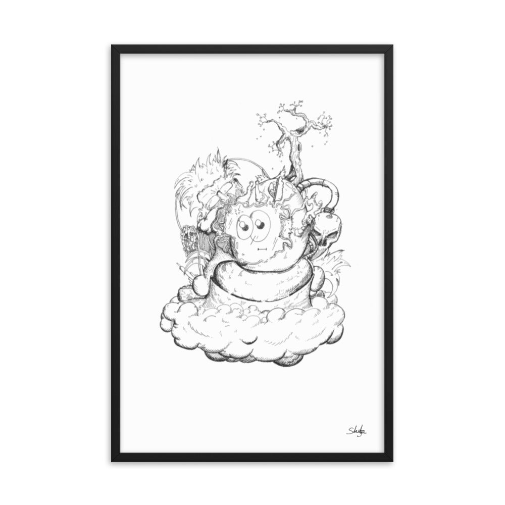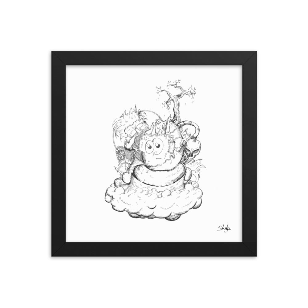 Free hand ink drawing scanned digitally for print on thick, durable, matte paper. The matte black frame that's made from wood from renewable forests adds an extra touch of class.