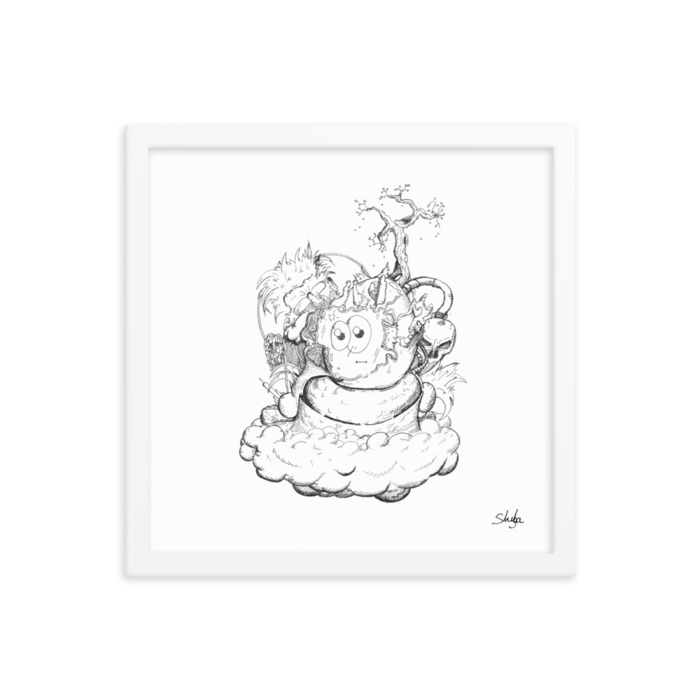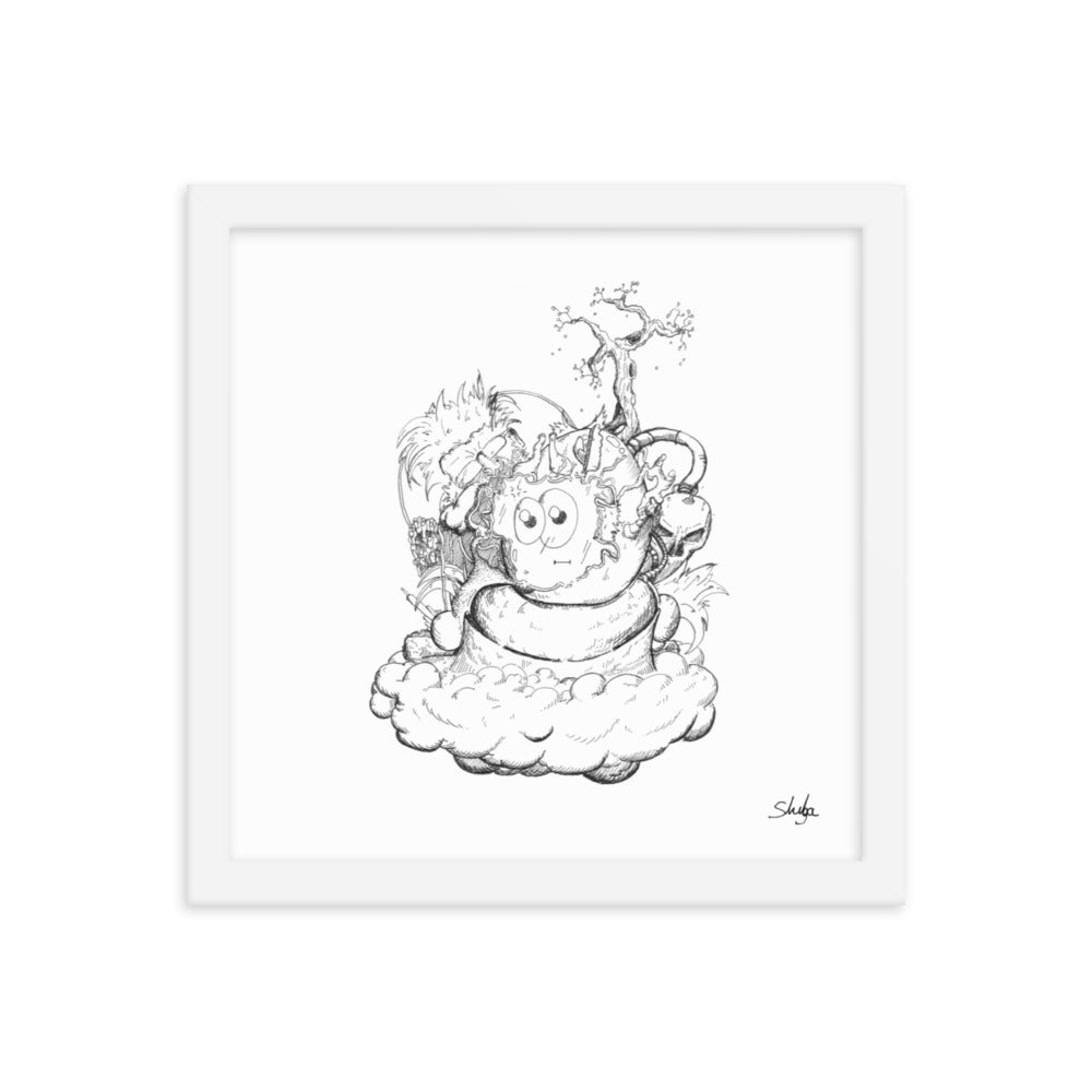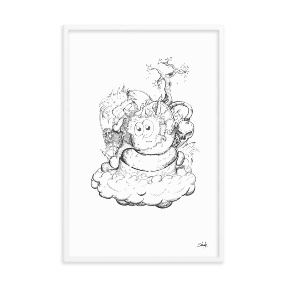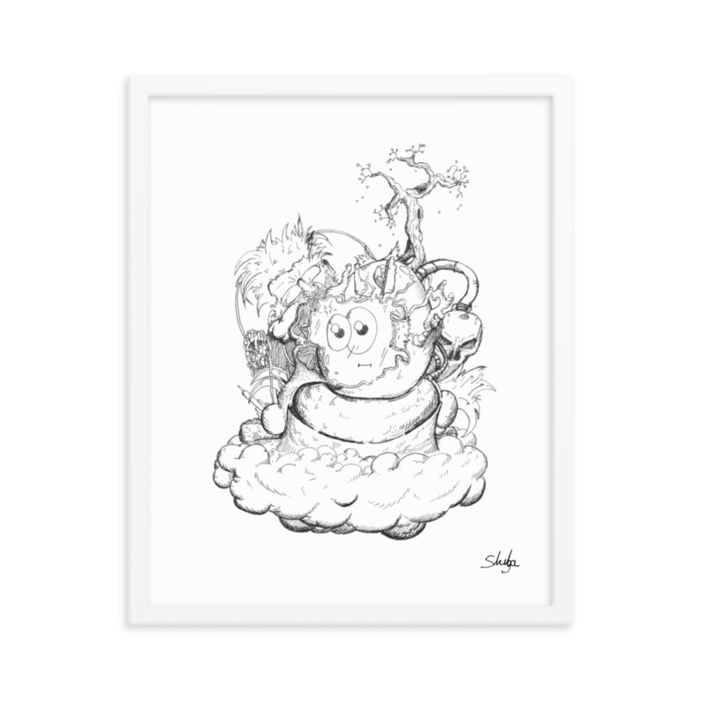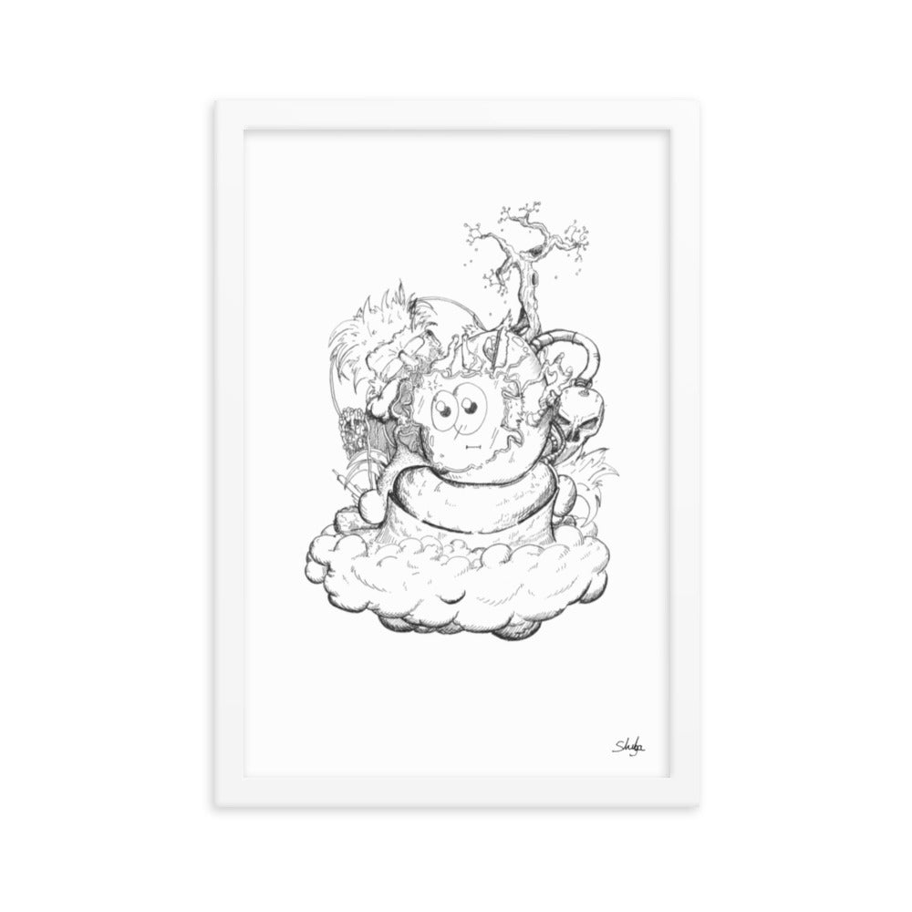 Free hand ink drawing scanned digitally for print on thick, durable, matte paper. The matte black frame that's made from wood from renewable forests adds an extra touch of class.