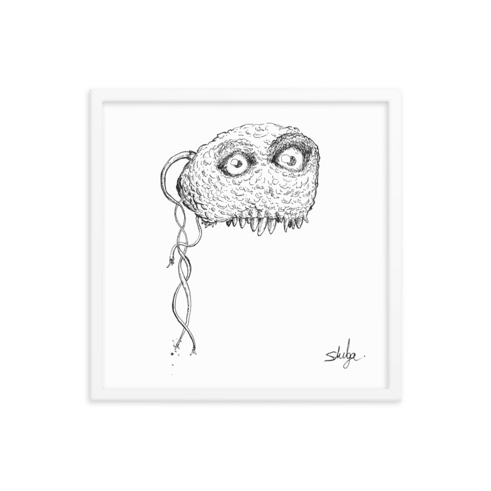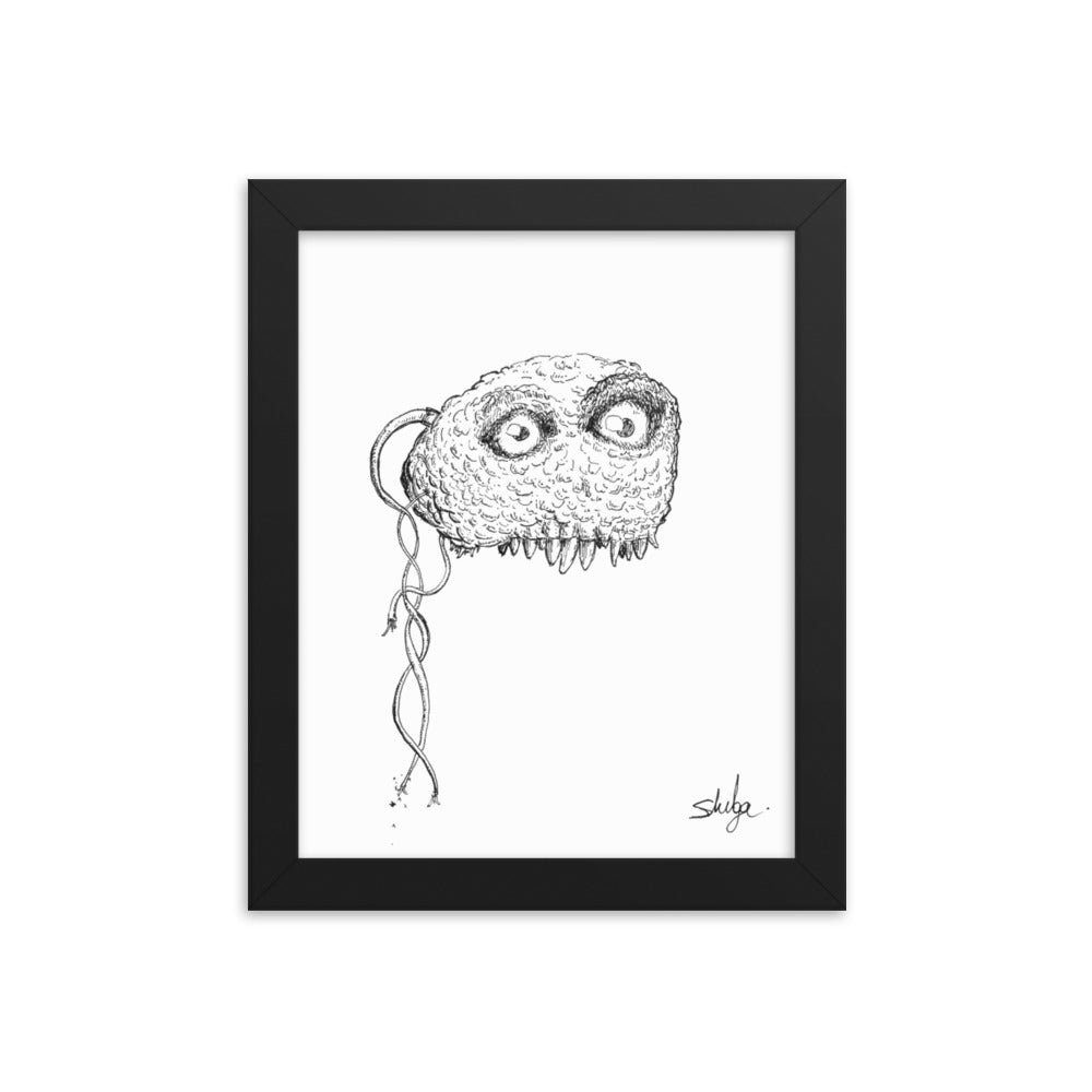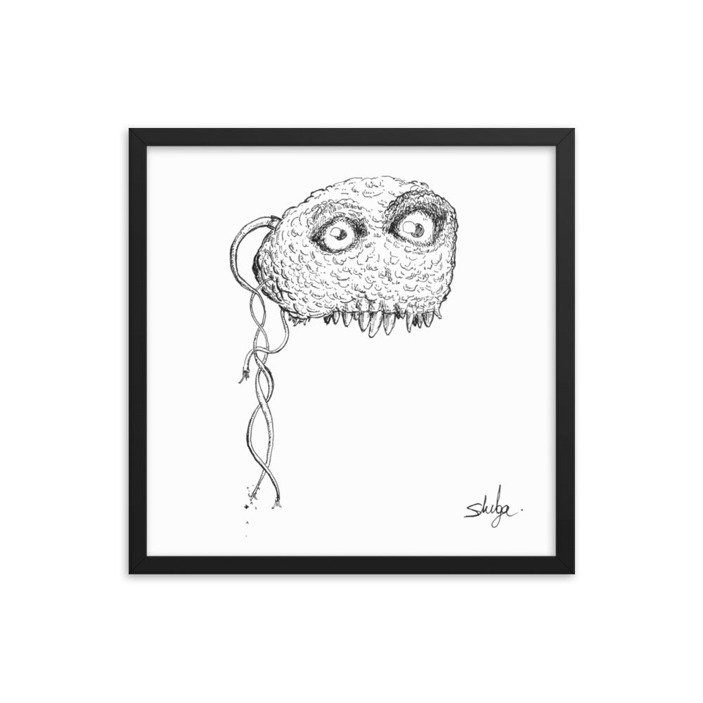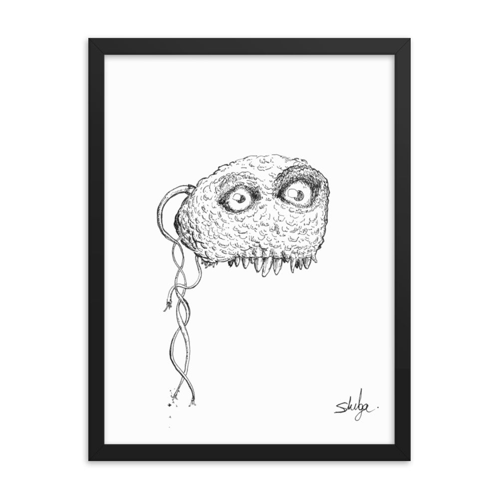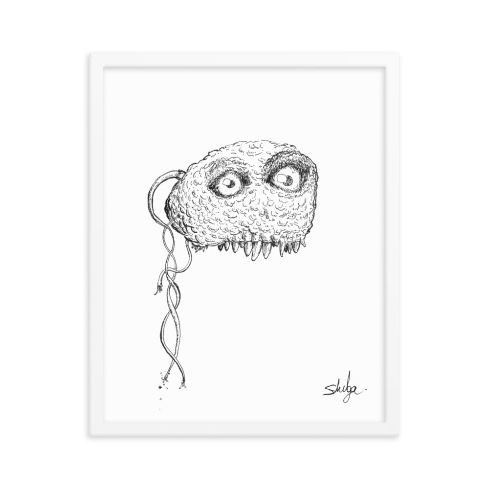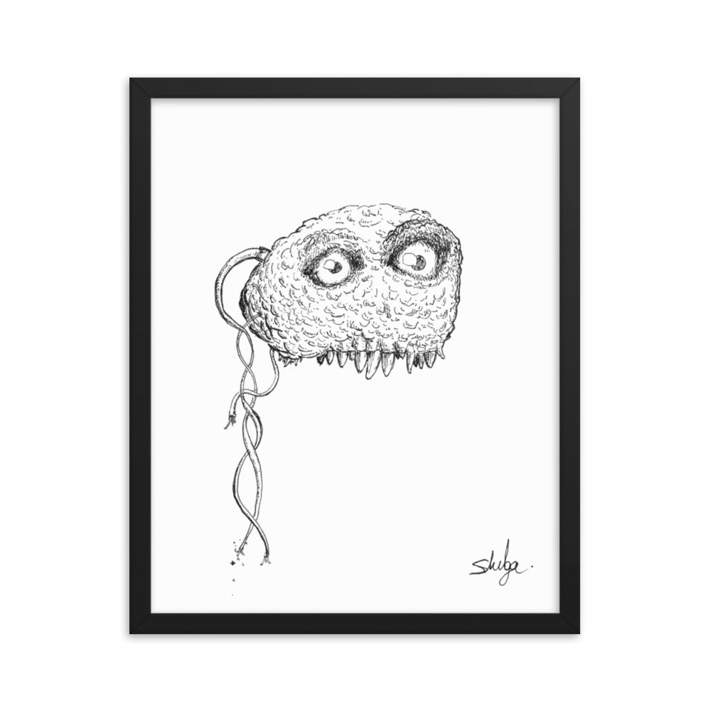 Free hand ink drawing scanned digitally for print on thick, durable, matte paper. The matte black frame that's made from wood from renewable forests adds an extra touch of class.