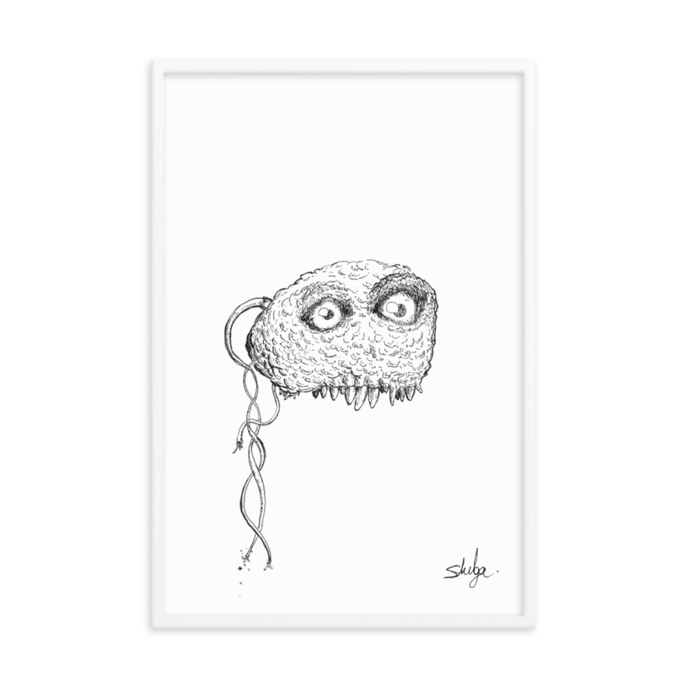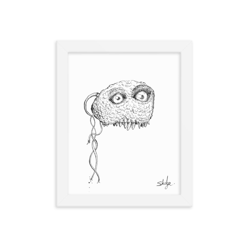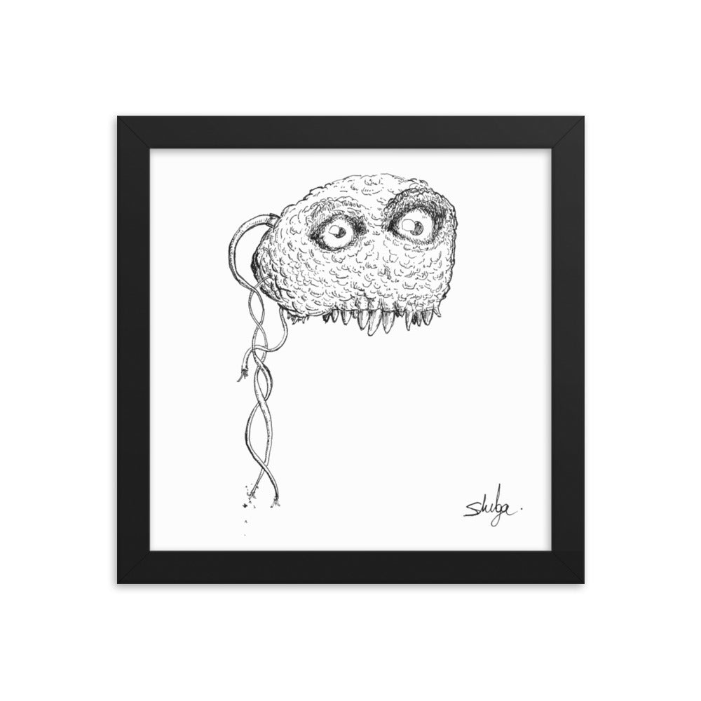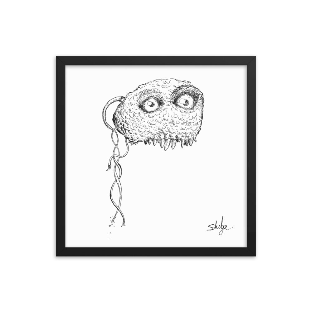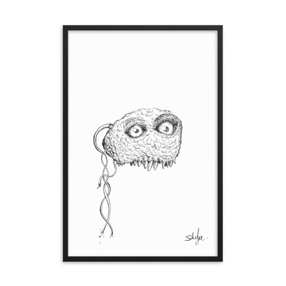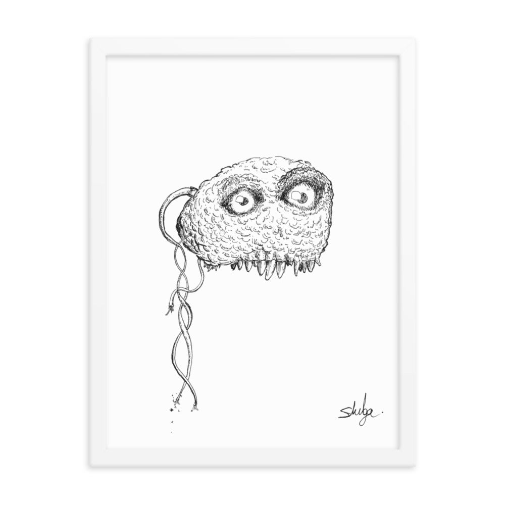 Free hand ink drawing scanned digitally for print on thick, durable, matte paper. The matte black frame that's made from wood from renewable forests adds an extra touch of class.