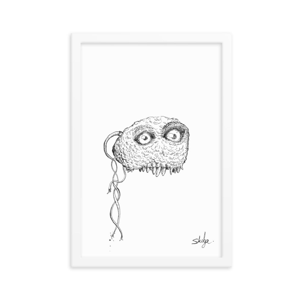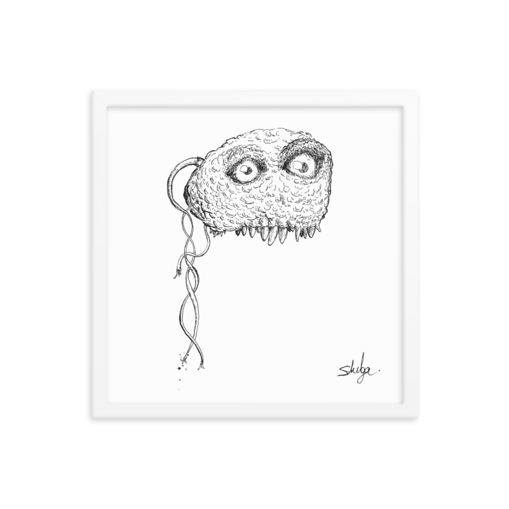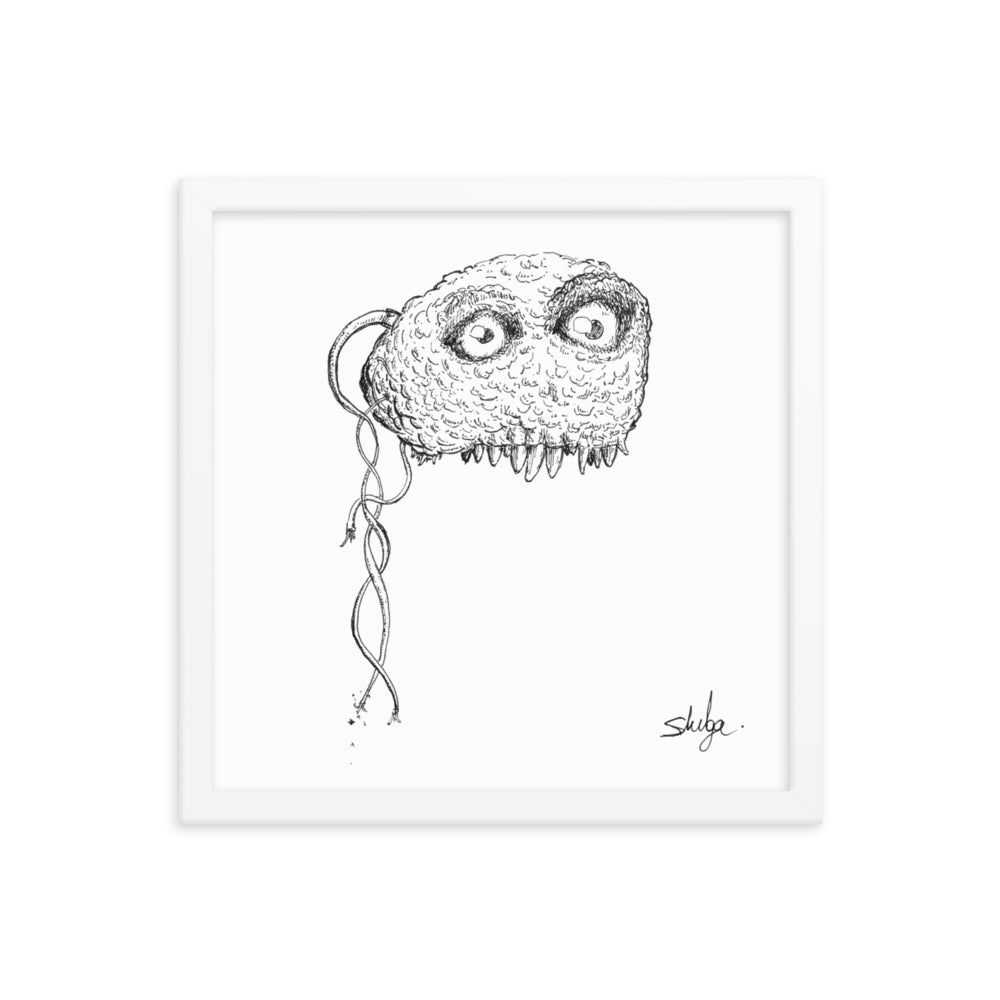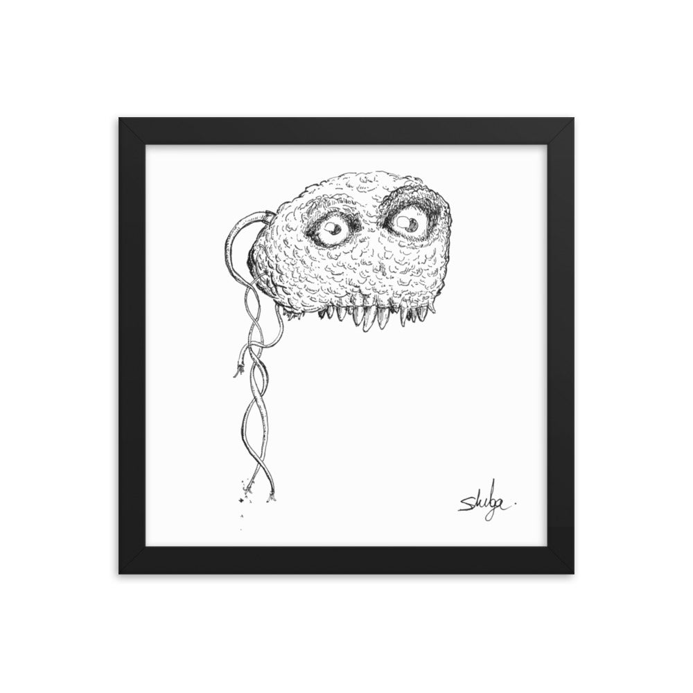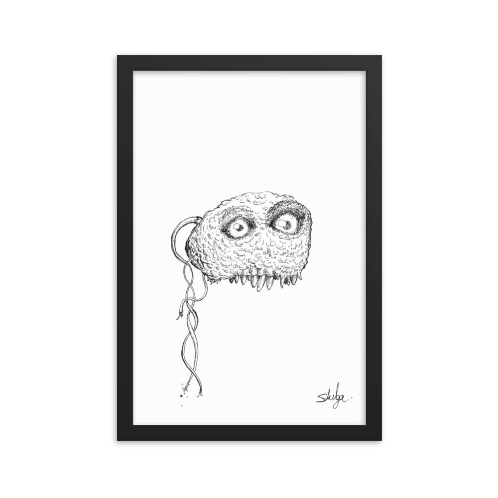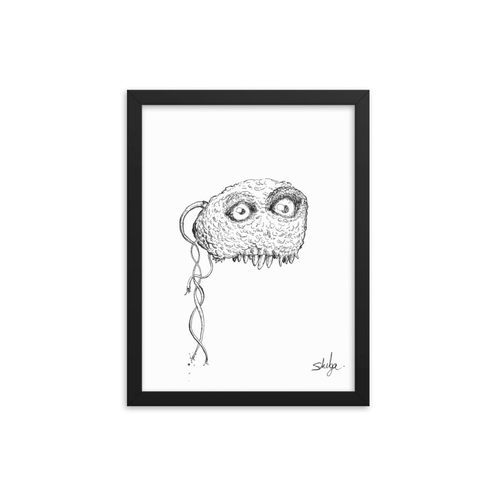 Free hand ink drawing scanned digitally for print on thick, durable, matte paper. The matte black frame that's made from wood from renewable forests adds an extra touch of class.
